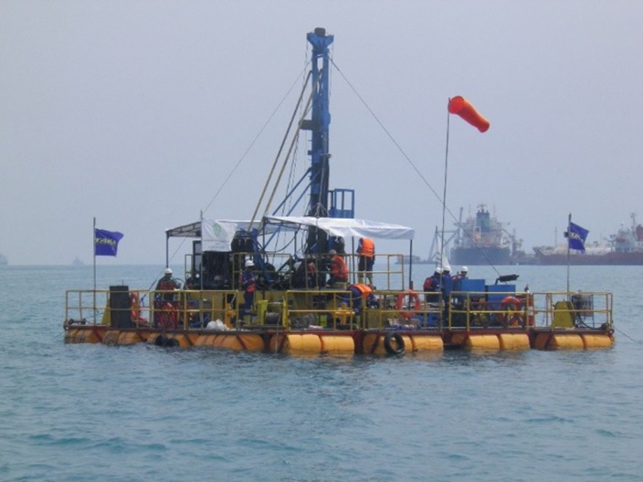 To bring and extend our capability to conduct exploratory and geotechnical drilling survey over the water we build wooden staging or wooden platform for shallow deep water down to maximum 3 - 4 m water depth. We also developed Modular Pontoon system to allow drilling and geotechnical survey to be conducted deeper down to maximum 25 m. CPT/U on the pontoon conducted using downhole CPT System.